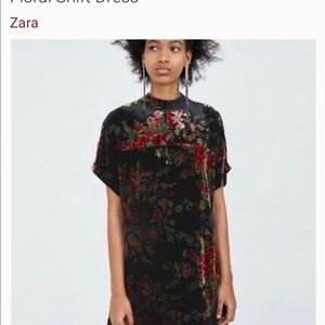 New With Tags. Zara Trafaluc trf Collection. Black velvet shift dress with multicolor floral pattern. Has high neck collar with two buttons at the back. Fully lined. Length 33" Bust 19" hips 19"