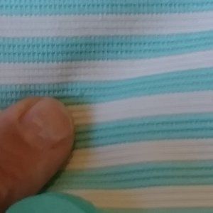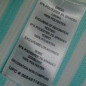 USED GOOD CONDITION YOUNGLAND TURQUOISE & WHITE STRIPED GIRLS DRESS SIZE 6X. THERE ARE A COUPLE SNAGS ON THE DRESS THAT ARE VERY SMALL, BUT CAN BE SEEN IF LOOKING FOR THEM. I HAVE TRIED TO PHOTGRAPH THEM AND USE FINGERS TO POINT THEM OUT. RN 16518 DRESS 97% POLYESTER 3% SPANDEX, LINING 100% POLYESTER. SUCH A CUTE DRESS WITH FABRIC RIBBON TIES IN BACK WITH TURQUOISE FLOWER RHINESTONE MIDDLE.