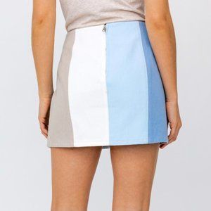 Super trendy colorblock mini skirt with various shades of blue, white and tan on it