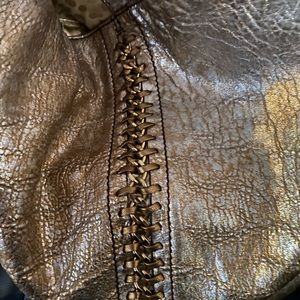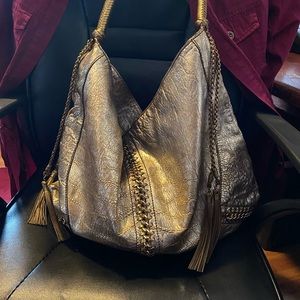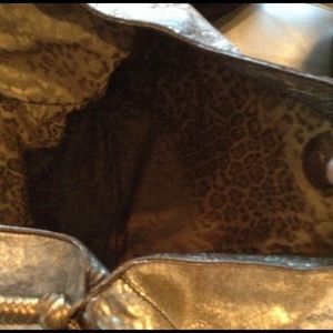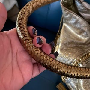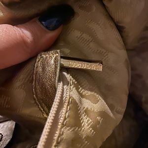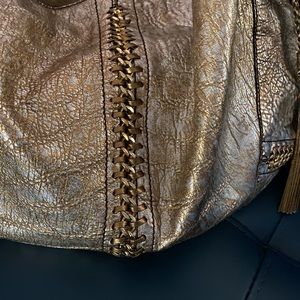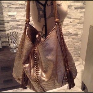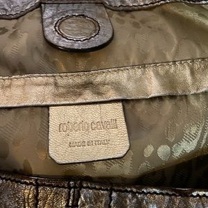 Stunning Roberto Cavalli hobo bag! One of a kind! Shades of champagne and bronze metallic. Buttery soft leather! This bag is everything. Perfect/flawless preowned. Gold chain braided into the leather. Light weight. Beautiful twin tassels on both sides. Gorgeous iconic leopard lining. Purchased in Italy for$4000 +tax.