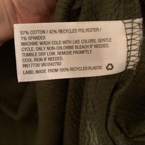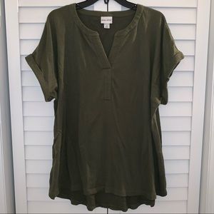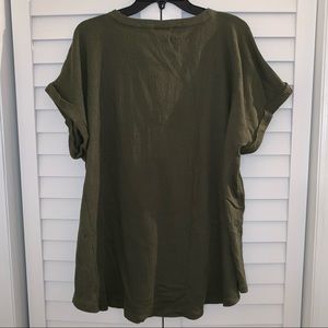 Pretty olive green roll sleeve t-shirt. Shirt isn’t thin or flimsy. Top has a relaxed fit and hi-lo hem for a flattering fit. Shirt also has a crinkled textured appearance that elevates it from your boring basic tee. Good condition!