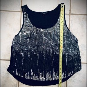 Get your SPARKLE on & shimmer in this black, relaxed tank top! This is very flattering as it is cut to move with the body. The scoop neck tank top has a rounded neckline in the front & back and a rounded hem. The back is solid black and sequins cover the front. Absolutely NO LOOSE SEQUINS or threads and no tears or blemishes. It is in EXCELLENT CONDITION.