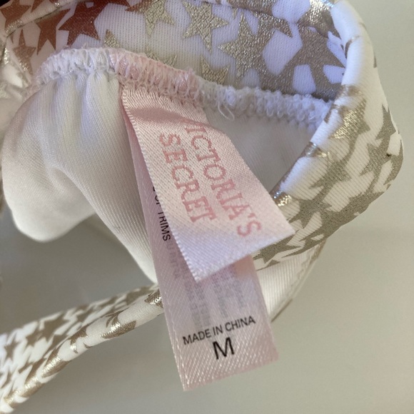 White with gold stars ✨ the top and swim cover are a medium and the bottoms a large. There is a flaw-nail polish in the inside of the bottom but isn’t visible from the outside. Worn once and in good condition otherwise.