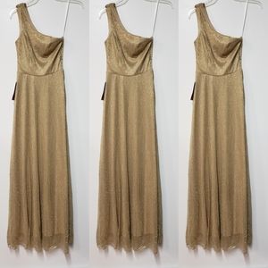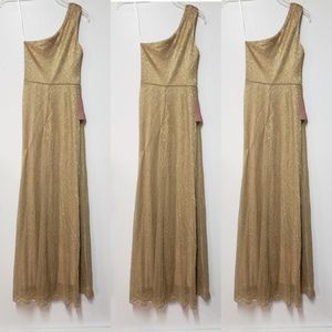 Metallic thread adds eye-catching texture and glam shine to this one-shoulder stunner.