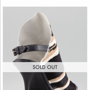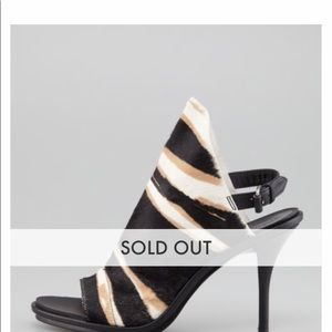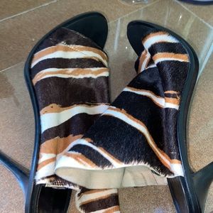 Gorgeous animal printed calf hair.high vamp straps. Open toe k heels. Leather insoles & soles. 4.5 inch heels. No hair lose or scratches. Heel straps have been removed. Sold as is. Extremely comfortable & great used condition. Made in Italy. Sold out in stores. Originally purchased at Neiman Marcus. Retails $945.00