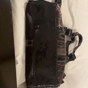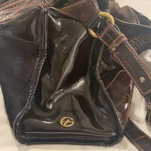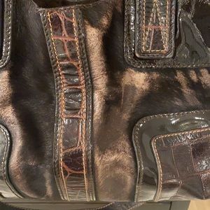 Brown Patton w crocodile accents w gorgeous horse hair back and front patches. Suede zip closure. Inside has side pockets for cell phone and accessories. Can be carried as an arm tote, shoulder bag or crossbody. Adjustable long strap. Excellent condition!