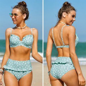 Take a dip or lounge poolside in this romantic bikini set consisting of a bralette-style top and a high-waist bikini bottom both with cute ruffled details.