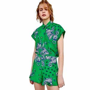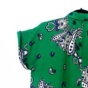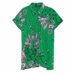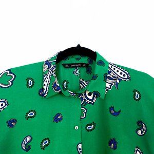 Zara Paisley Shirt Green Black Blue Button Down High Low Hem Blouse Short Sleeve Top Size Small - Excellent condition.