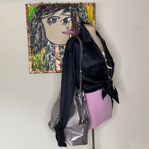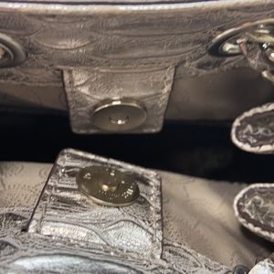 Michael Kors satisfies every sense of style! This silver reptile, chain drawstring bag is hot! 11x11x6. Silver MK tag. On the bottom, in the seam, there’s a mark. Please see pictures. Magnetic snap.4 open pockets. 1 zipper pocket, with the protective paper on it. Key clasp. Grey MK liner. This a beautiful bag! Please feel free to ask any questions! 😊