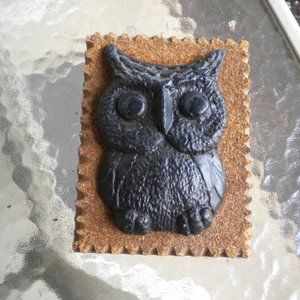 Vintage Rare MCM Cast Iron Owl Wall Cork backing with back made of some kind of solid acrylic plastic back with green