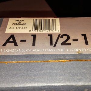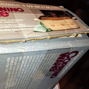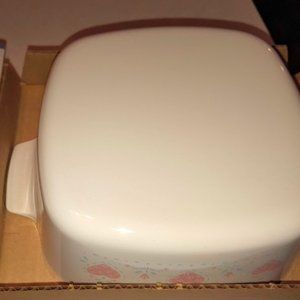 WHAT A SWEET FIND--a fantastic gift if you have a friend/family member who collects! This "Forever Yours" design CAN be YOURS forever, especially since it is in never-used new condition in original packaging/box that is open just on one end & then was taped shut. I.5 quart square w/brown glass lid, even includes Use-and-Care booklet. Online research shows NO others of this design in original packaging & box, so this is a great find for cookware collectors--AND Oven/Microwave/Dishwasher-safe, but please hand wash to preserve the color & design. SFPF home.