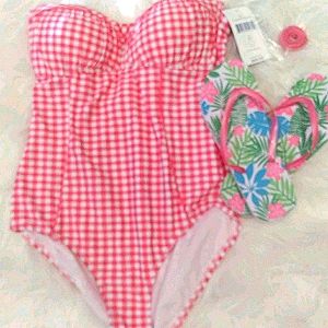 Stunning! The lines of this suit are so flattering!! Pink suit only.Flipflops included! Size 8.