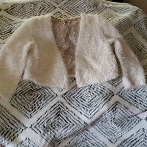 Knitted and knotted creme colored fuzzy cropped cardigan. Soft lace lining. No pockets. Laid out flat armpit to armpit it is 21in. From shoulder to hem it is 17in. Shoulder to sleeve cuff it is 20.5in.