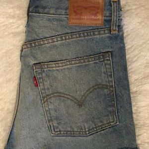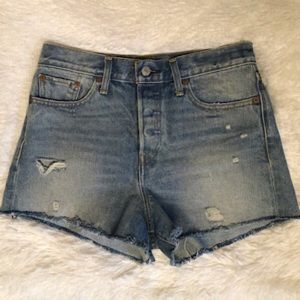 NWOT (never worn). The classic pair of Levi’s cut-off shorts with these having an ultra high-waist. These are a straight fit through the hip and thigh with them being made of 100% Cotton.