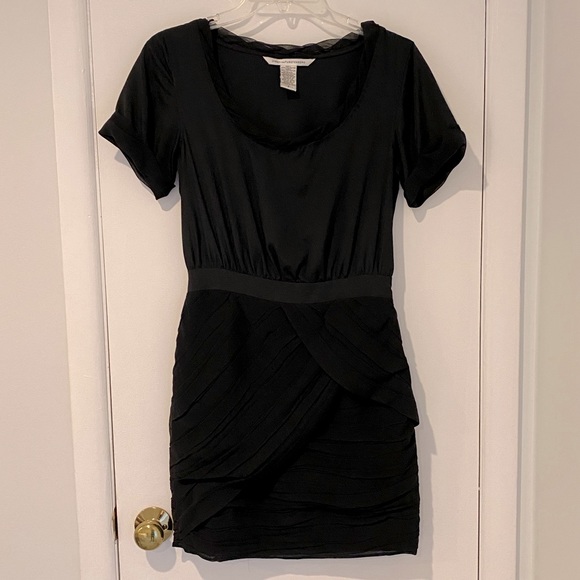 Beautiful black DVF dress featuring a silken bodice, an asymmetric pleated skirt, and twisted chiffon trim at the neckline. Short sleeves with twisted cuffs; hidden side zip closure. Size 2.