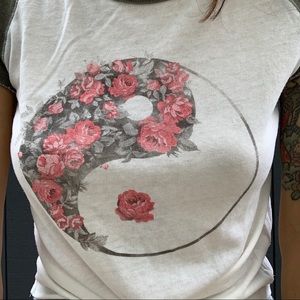 This super soft and light t-shirt has a floral yin-yang graphic on the front and baseball style with white body and army green sleeves. 90s Throwback! 54% Cotton, 45% Polyester. Never Worn!