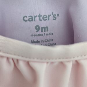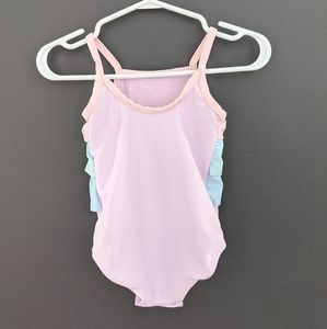 Cute pastel color one piece swimsuit/bathing suit. Pink green and blue ruffles on front. Snap closure on bottom for easy changing. Size 9 months. EUC.