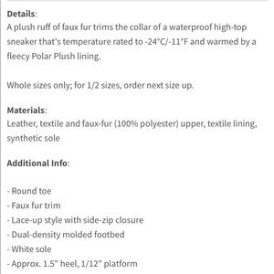 Details: A plush ruff of faux fur trims the collar of a waterproof high-top sneaker that's temperature rated to -24°C/-11°F and warmed by a fleecy Polar Plush lining.
