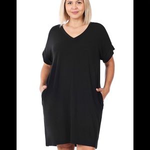 BNPlus Size Rolled Short Sleeve Black Dress Size Various With Pockets Body Length “37.5 Bust 48” Approx 1X 57% polyester, 38% Rayon 5% Spandex; Slip On Run Errands/ Wear with slides or heels 1X( 14-16) 2X(18/20) 3X( 22-24) Length 37”