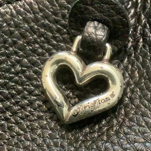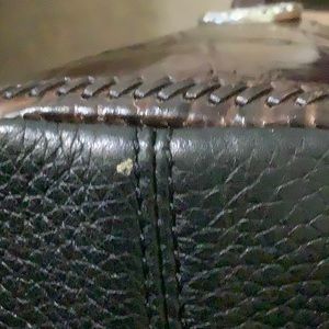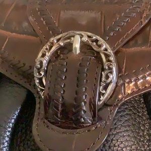 Looks brand new except for some discoloration on the heart fob, small smudge on brown side and one very small tear on bottom edge. Please see photos. This BRIGHTON Collectible black pebble leather handbag has brown croc trim on the flap and ends. Braided straps, snap closure, usual Brighton silver tone hardware and beautiful, colorful fabric interior. Measures 12” across base and goes down to 9” at top opening. 6.5” high and 3.5” deep.
