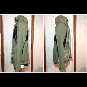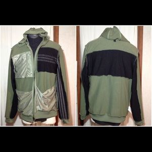 Very nice gently worn condition with hood (missing drawstring), zip up front, ribbed cuffs and waistline, 2 front exterior pockets and triple stripe on right sleeve. See pictures for additional description.