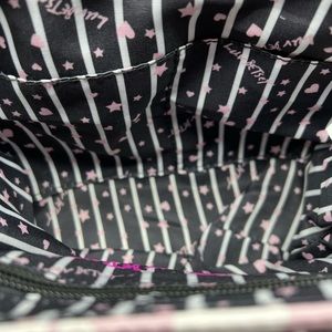 Interior is black with white stripes and pink stars and hearts