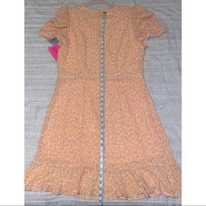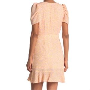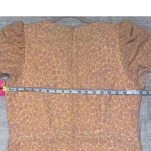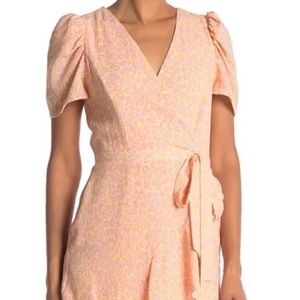 A trendy animal pattern accents this woven mini dress that features short puff sleeves and a faux wrap design.