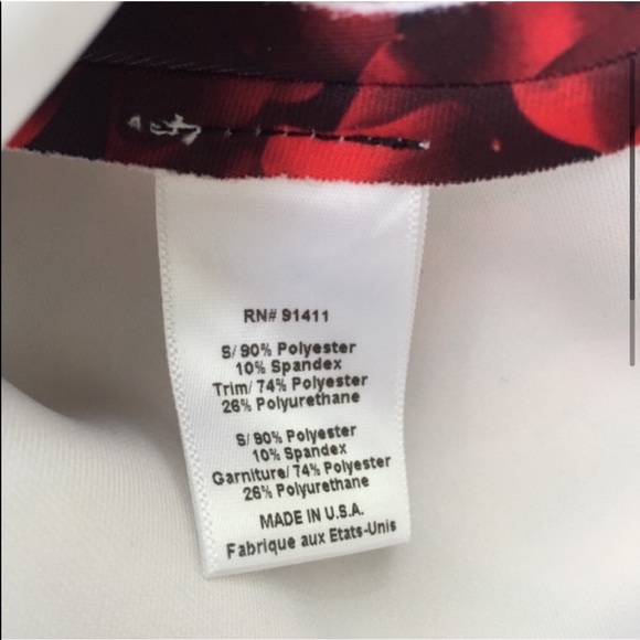 90% polyester, 10% spandex. Trim: 74% polyester, 26% polyurethane.