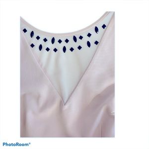 This gorgeous dress has V neck in front with mesh & geometric black stones. Back is V neck with hidden zipper, hook & eye closure. The dress is fully lined.