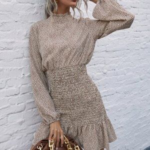 Lantern Sleeve Shirred Ruffle Hem Allover Print MINI Dress