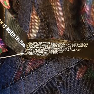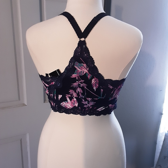 Microfiber, lace floral, navy racer back bralette. Deep v neckline, wireless cups, adjustable straps. Keyhole racerback.