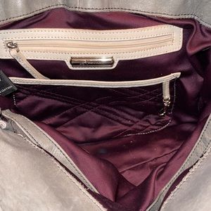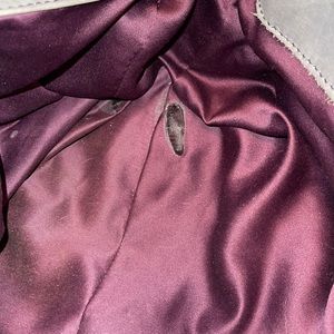 Well loved but still have a lot of life. There are several marks as shown in picture and one large spot on interior. Still it is a very pretty purse. I do not have the cross body strap although there is a spot for longer strap.