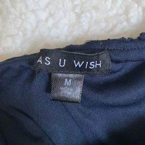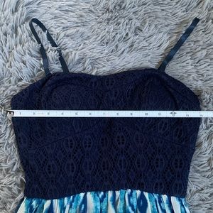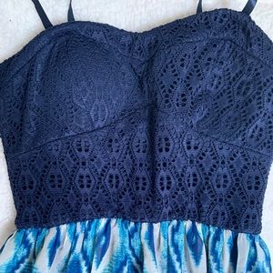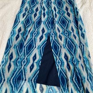 Navy and White maxi dress. Top material in knit, bottom material is silky & flowy. Slit in the back make it easy to walk in. Padded cups & adjustable straps. Perfect for formal or casual occasions. Dress it up with a stretchy waist belt.