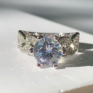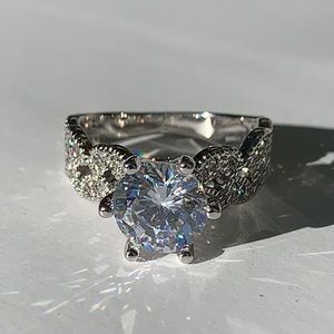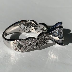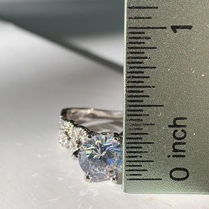 Sterling Silver 925 Rhodium Plated Engagement Ring set with a Round Center and tiny crystals on each side. This is definitely a show stopper! It weights approximately 3.73 grams.