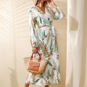 Boho Tropical Leaves Wrap White Midi Dress