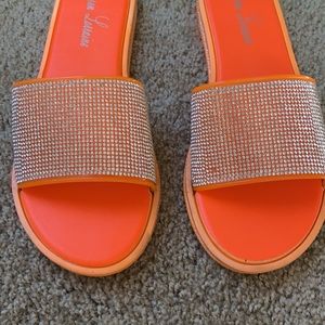 Beautiful orange slides with faux crystal straps and silver glitter lining around the edges. Size is Large- slightly big for me and I am an 8.5. Worn once, briefly.