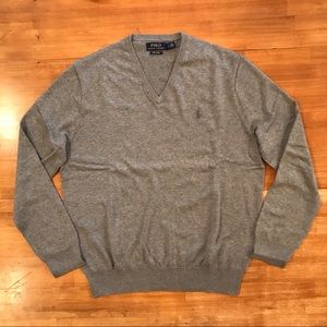 Fine Pima cotton grey v-neck with ribbed hem and cuffs and pony logo on left chest. NWT mint condition.