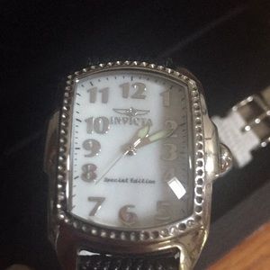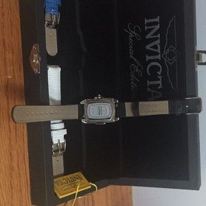 Pre-owned. Black strap worn a couple of times. Others unused. All in excellent condition. Most of the stones around the watch face are lost. Interchangeable bands.