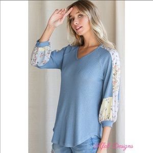 ❤️LAST! Blue V Neck Floral Contrast Waffle Top!