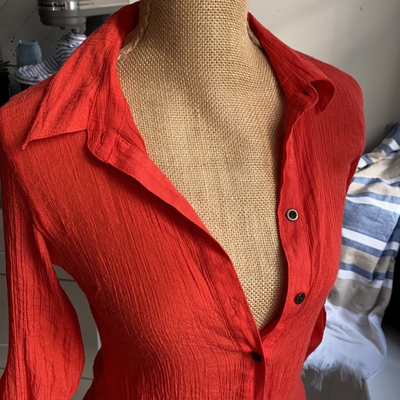 Super cute quarter length sleeved top that buttons down with a twist tie. Has a collar, can dress it up with slacks or dress it down with jeans. Size small, cute blouse.