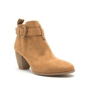 Tan buckle suede block heel ankle bootie