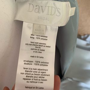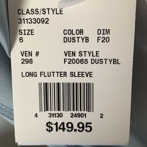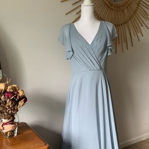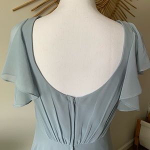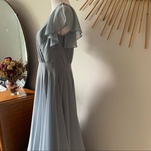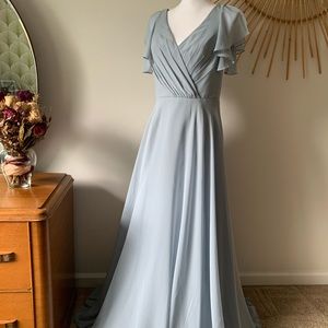 David’s Bridal long flutter sleeve dress in dusty blue. Size 6. NWT. Never worn or fitted. Shell: 100% polyester. Lining: 100% polyester.