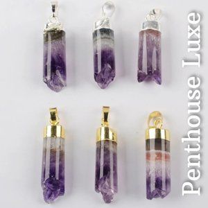 Raw amethyst cluster, cored, then electroplated with gold or silver over brass. Choose metal color at checkout. Made with REAL amethyst, perfect for those interested in chakra, reiki, and meditation! Chain/cord included upon request.