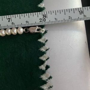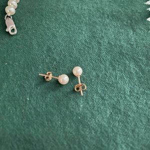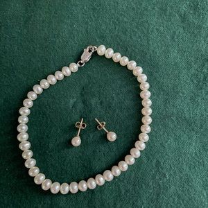 Pearl bracelet and earrings. The bracelet has a silver lobster closure and measures 8”. The earrings have gold posts. Both are very dainty and feminine.