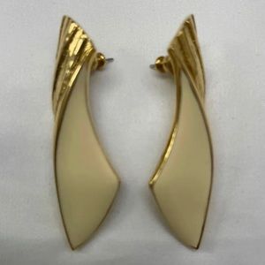 Bold dress earrings with shiny gold tone. Cream colored with enamel finish. Substantial weight for elegant appearance, but not uncomfortable. Posted backs. Excellent condition, offers welcomed.