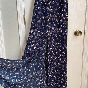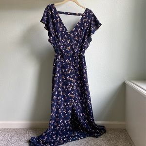 Super cute, navy floral dress from iZ Byer. Buttons down the front to the slit. The slit is about knee height but I’m 5’4” and this puddles 3-4 inches on the floor on me. Flutter sleeves. The back few inches of the waistband are elastic, which includes a pull string to cinch around your natural waist.