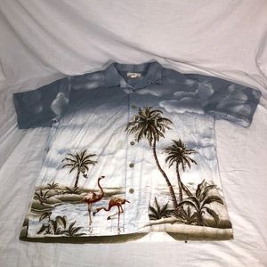 This Paradise Shores Shirt is in great condition. There is an all over print of flamingos on a beach. See all pics!