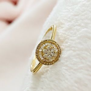 This beautiful ring features all geninue, natural, earth mined baguette and round diamonds (GH Color / VS-SI Clarity). Sparkly, eye-clean round diamonds make up a lovely floral cluster design in the center, surrounded by a unique baguette and micro pave halo on the exterior.