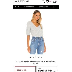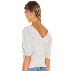 Cropped 3/4 Puff Sleeve V Neck Top in Heather Grey.