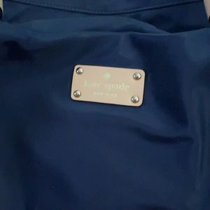 This adorable navy nylon purse from Kate Spade is a perfect purse for anyone. The navy with tan leather accents and a bright red inside is just too cute. This purse has a small zipper pocket and two pockets on the other side to help keep you organized. Excellent condition, like new.